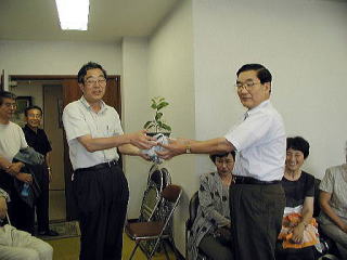 総会当日の午後2時に母校を訪問しました。 大きな実の椎の木の苗を贈呈しました。
