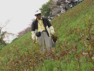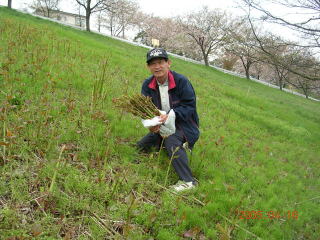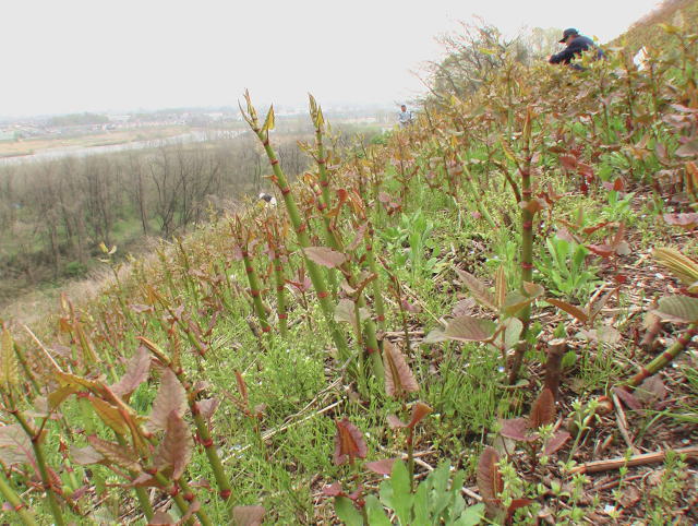 去年も来たというポイントに到着して驚いた。 土手の斜面一帯にイタドリが群生している。これにはベテランの一郎さんも興奮気味。あっという間に車のトランクが満杯になってしまった。 咲き始めた八重桜がみずみずしい、清楚な花を楽しませてくれた。