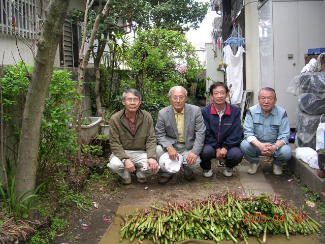 大収穫に、来年もここしかないとイタドリ談義に花を咲かせながら、一路、拓南さん宅へ。 私以外は花よりお酒のメンバーばかり。 収穫したイタドリを前に記念写真。 今年はベテラン揃いで恒例のイタドリの選別は行われませんでした。でも写真のようにイタドリは粒ぞろいです。
