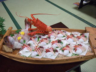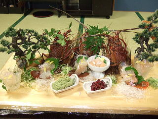ちなみに参加できなかった皆さんに、いやがらせに鳥羽の民宿で出た魚料理を並べてみましょうか。 イセエビのさしみ(一人一匹づつ)、鯛といかとサザエの舟盛り五ハイ、小あじの酢漬け、塩鯛のやきもの5尾、カマスのおばあちゃん煮つけ、大ハマグリ、他、これでもか、これでもかと出てきました。 野村