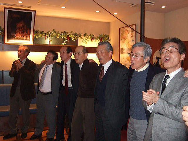 懇親会の最後は恒例の校歌&応援歌の斉唱です。 音頭はもちろん大阪からはるばると駆けつけてくれた中塚君です。