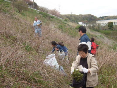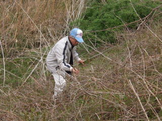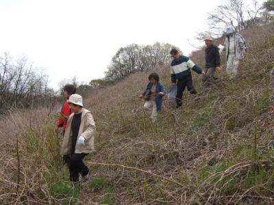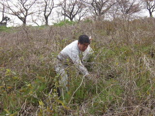 滝山台到着後、藤原君の指示で斜面の一番下まで下がりました。 斜面を登りながら、横一列になって収穫に当たろうという作戦です。 斜面を下がれば下がる穂で、立派なイタドリが現れました。