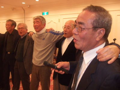 懇親会の最後は恒例の校歌&応援歌の斉唱です。 音頭はもちろん大阪からはるばると駆けつけてくれた中塚君です。