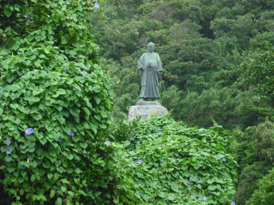 太平洋を見据えた中岡慎太郎の銅像を眺めながら、室戸岬海岸ジオパークを散策。 山上の燈台をバックに記念撮影。