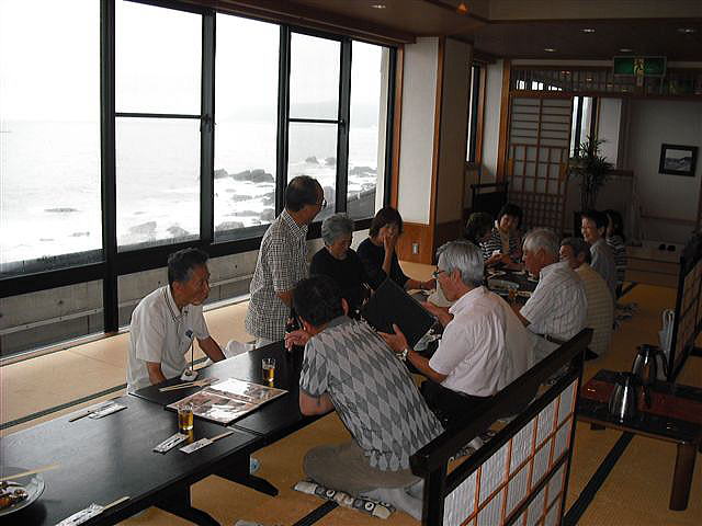 昼食は「キラメッセ・室戸」のレストラン2階をキャン氏の計らいで借り切り、窓外に室戸の海を眺めながらまたもや海鮮魚三昧。 それぞれお土産を沢山買い込んで帰途に。