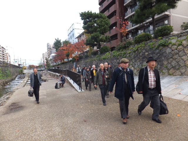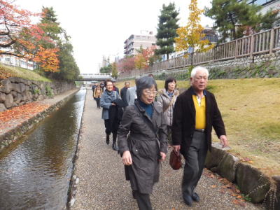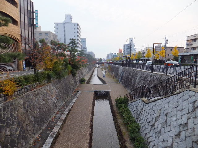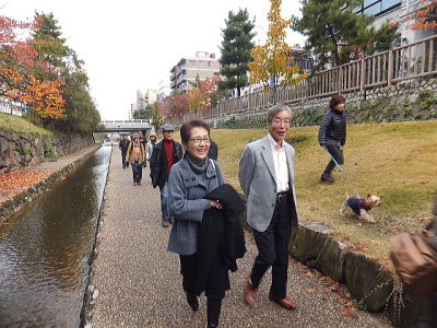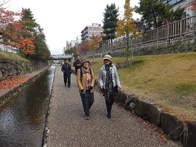宿泊している「ホテルルビノ京都堀川」を9時に出発し、堀川の遊歩道を地下鉄東西線「二条城駅」まで歩きました。 堀川は、約1200年前の平安京造営時に運河として開削され、主に大内裏(天皇の住居とその周囲の官庁一帯)造営のために、北山連峰の豊富な木材運搬の運搬路として利用されていました。 その後、堀川は物資の運搬のほか、貯木場、農業用水や友禅染など、京の人々の暮らしや産業を支えてきました。
