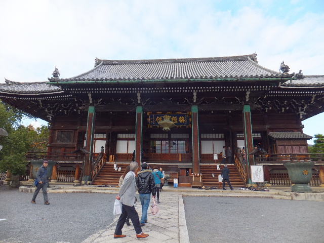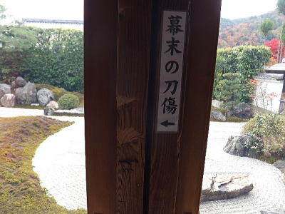 また、この本堂の数ヶ所の柱には幕末の「禁門の変(蛤御門の変)」の時、ここに陣を構えた長州藩士が試し切りをしたという刀傷が残っています。 刀傷が残る本堂の各部屋には、竹内栖鳳とその一門ほかの日本画家の作品が飾られています。 表門を入った左手に建つ毘沙門堂には三国伝来の毘沙門天像が奉られているが、当初は比叡山の無動寺にあったものが移されたとのことです。