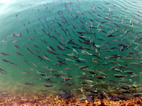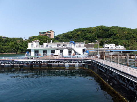 呼子の海に架かる桟橋を渡り、一歩足を踏み入れると、店の中央にある大きないけすが目に飛び込んできます。 呼子萬坊の海中レストランは、日本で最初に作られた海中レストランとのことです。 レストランは、何層かに分かれていて、下の階ではいけすをぐるり囲む席になっていて、海の中という異空間での食事を楽しむことができます。