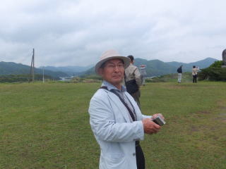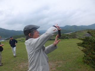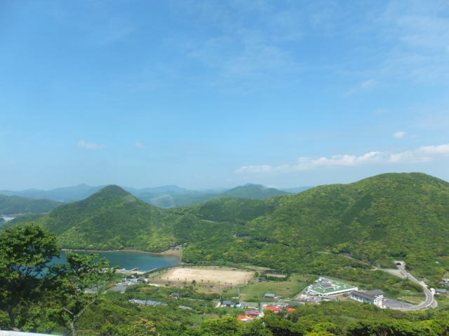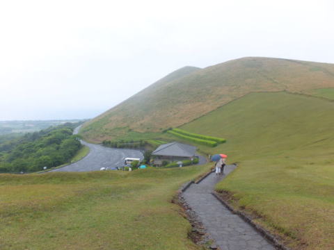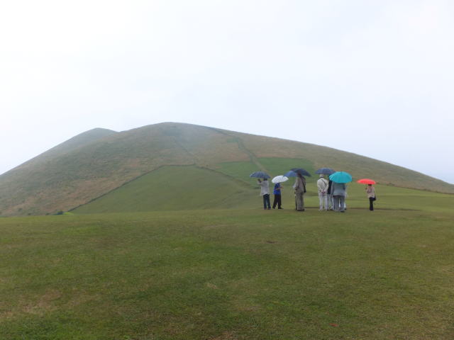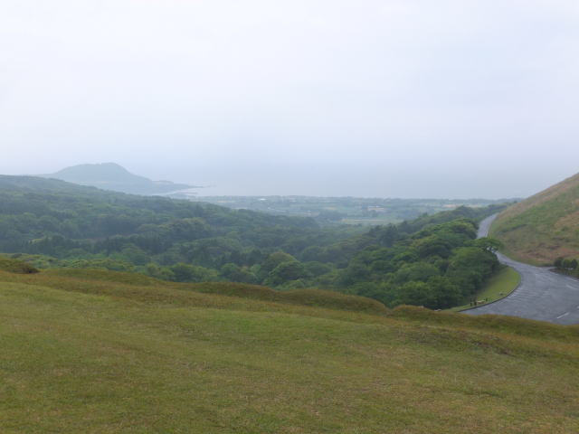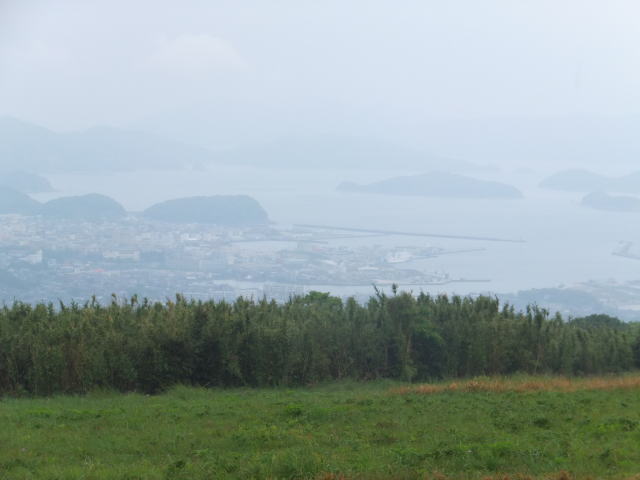 その中の標高315mの鬼岳は、全山芝生に覆われていて、尾根伝いのトレッキングでは眼下に広大なパノラマが展開し、福江の市街地や遠くは上五島などを望むことができます。 今回は中腹の展望所のある場所まで登りましたが、この日は10時過ぎまで小雨模様で、眼下の福江市街の街並みは残念ながら霞んでいました。