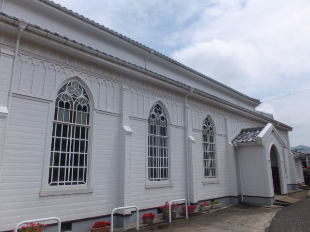 「魚津ヶ崎公園」の次に、天然の良港の水ノ浦にある「水ノ浦教会」を訪ねました。 水ノ浦教会は明治13年(1880年)に創建です。 水ノ浦の入り江を望む丘に立つ天主堂は、木造教会堂としては島内最大規模の建物です。 明治13年(1938年)に現在の聖堂に改築されました。 白を基調とした聖堂内は見事なコウモリ天井と色鮮やかなステンドグラスを通して注がれるやわらかな光が印象的で、厳粛な雰囲気をつくりだしています。