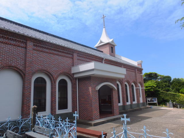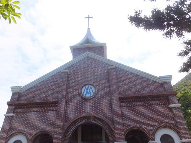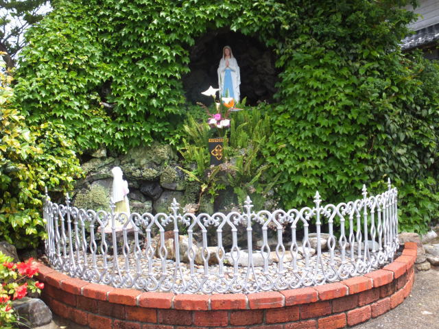 魚藍観音展望台の次に、「井持浦教会」を訪ねました。 明治28年(1895年)、フランス人宣教師ペルー神父によって創設されたレンガ造りの聖堂は、五島最初のロマネスク様式です。 その祝別式の時、ペルー神父の提案により日本で初めてのルルドが造られることになり、明治32年(1899年)、フランスのルルドを模して信者によって五島各地から集められた岩石でルルドおよび霊泉が完成しました。