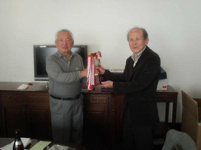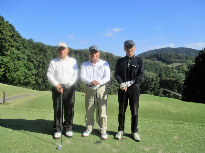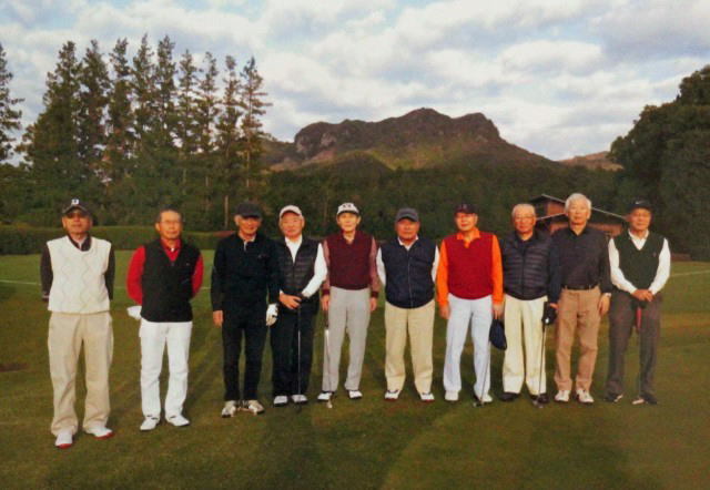 28日ゴルフ大会は好天に恵まれ、清々しい空気の中で古賀志山を望む絶好のゴルフ日和となった。 大半のメンバーが何がしの故障を抱えての参加で、前夜祭で体調不良を訴えたメンバーも、いざコースに出ると腰の痛いのもなんのその、元気なプレイがみられた。 結果は実力者宇田君が優勝、遅咲きながら進境目覚ましいパワーヒッター中村君が準優勝、新設した優勝カップを宇田君が千葉県に持ち帰った。