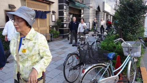 築地場外市場では入り組んだ路地に数多くの店が軒を連ねています。 今回のオプションツアーで、築地場外市場は、女性参加者が一番楽しみにされていた場所です。 食事と散策のために1時間が設けられていましたが、築地場外市場は平日にもかかわらず大変な賑わいでした。