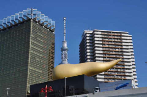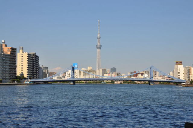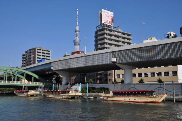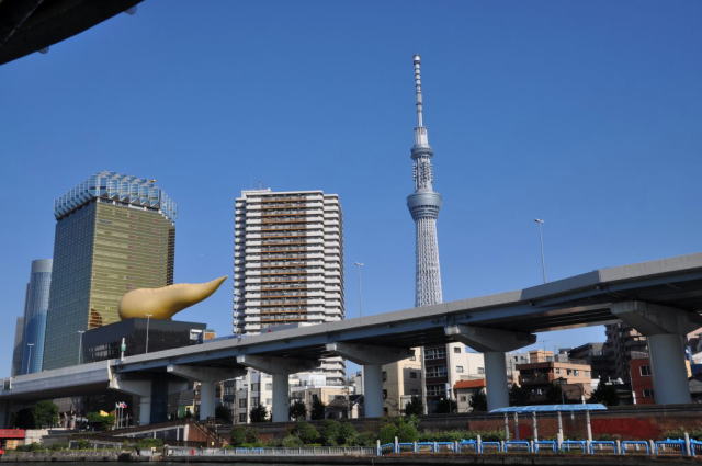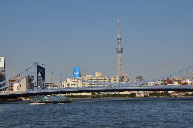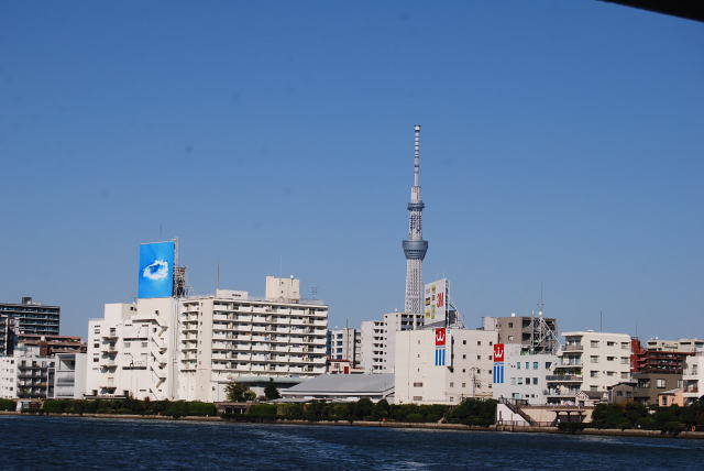 新しい東京の名所である東京スカイツリーも船内から眺めることができ、最初は小さく見えていた東京スカイツリーも、徐々に大きくなってきました。 浅草で船から下りると、目の前には次の目的地である、東京スカイツリーが大きく聳えていました。