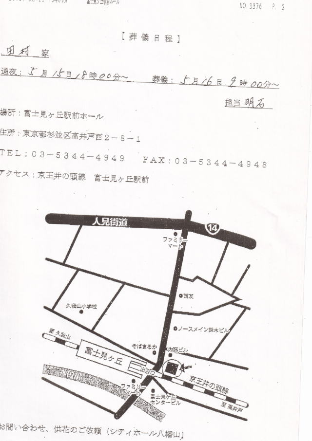 Sホームの田村耿二君が逝去されました。 謹んでご冥福をお祈り申し上げます。 1 逝去日 5月10日(木) 2 病状等 不明(南船橋駅で倒れて救急車で運ばれましたが帰らぬ人となりました) 3 葬儀等 喪主:田村恭子(妻) 通夜:5月15日(火)18時〜19時 告別式:5月16日(水)9時〜10時 場所:富士見ヶ丘駅前ホール(京王井の頭線富士見ヶ丘駅出口正面) 東京都杉並区高井戸西2−8−1 電話:03−5344−4949