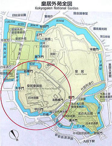 赤丸で囲んだエリアが今回観光の東御苑地区