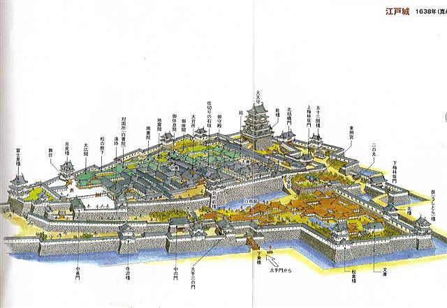 1636年:史上空前の巨城として江戸城竣工 *堀東西6キロ、南北4キロ *城門111(外郭20、内郭11、場内80) *天守1、城櫓20、多聞26 1657年:明暦の大火により江戸城消失 1659年:江戸城再建(天守閣再建されず)